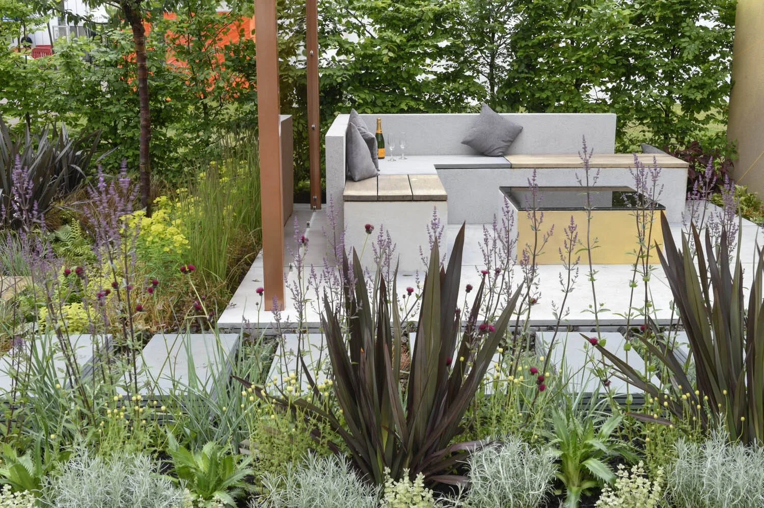 The modern lines of the seating areas and adjoining path reflect his dynamic approach.